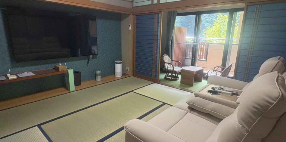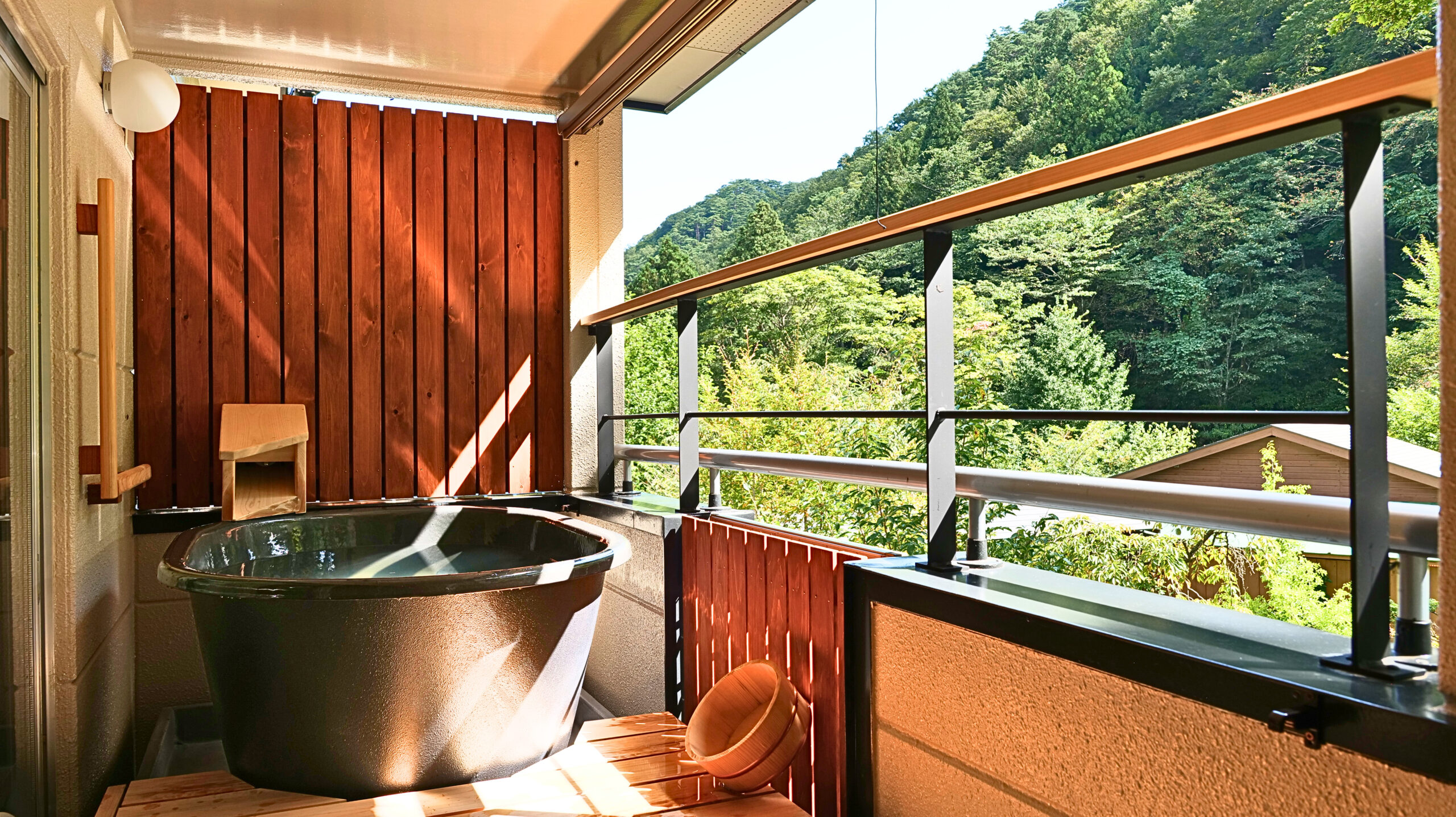 4名様までご宿泊いただけるお部屋です。壮大な山々の景色を眺めながら、静かに流れる時間を楽しめます。美しい渓谷、磊々峡から着想を得た紺碧色の広縁、自然を堪能できるバルコニーがあります。